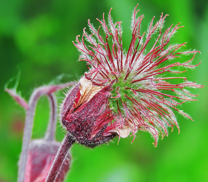 Гравилат речной (Geum rivale) - неприметное на первый взгляд растение, предпочитающее влажные места: сырые низины, берега водоёмов, лесные опушки. Цветок его устроен замысловато и напоминает чесалку для пуха: многочисленные пестики собраны в яйцевидную головку, сидящую на опушённой ножке, удлиняющейся при созревании плодов. Многочисленные плоды гравилата - семянки, каждая из которых заканчивается крючком, образованным остающимся при плодах и удлиняющимся волосистым нижним члеником столбика. Тончайшие ворсинки ещё более усиливают эффект сцепления, кроме того, они создают "пушистость" и обилие мелких, едва различимых деталей, что при близком рассмотрении выглядит завораживающе. Крючок этот служит для того, чтобы созревшие плоды крепко цеплялись к любой ворсистой поверхности и таким образом распространялись человеком и животными. Гуляя в зарослях гравилата, вы можете не обратить на него внимания, но, придя домой, наверняка заметите "назойливые репьи" на своих брюках и шнурках ботинок.