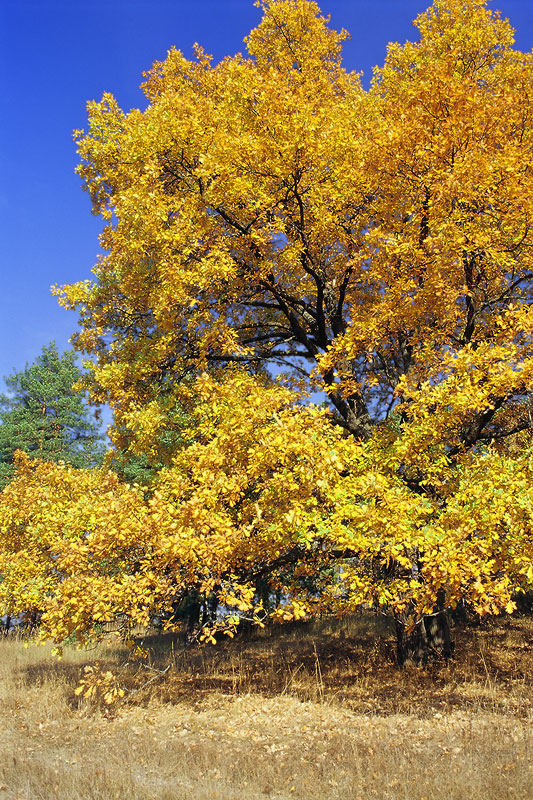 В начале золотой осени есть краткий миг, когда на дубах листья вдруг меняют зелёный цвет на яркий золотисто-жёлтый,