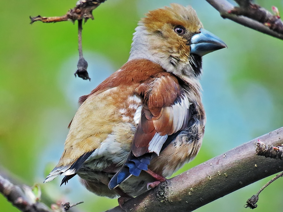 Комментарий. Старый яблоневый сад в Кунцевском парке - излюбленное место для самых разнообразных птиц, многие из которых здесь гнездятся. Судя по рассказам любителей пернатых, кого здесь только не встретишь! Вот и мне довелось увидеть редкую для Москвы птицу - этот самец обыкновенного дубоноса (Coccothraustes coccothraustes) сидел некоторое время на ветке яблони совсем рядом, я далеко не сразу его разглядел среди ветвей. Перья на его голове почему-то взъерошены: то ли от холода, то ли от его птичьих, непонятных нам, людям, раздумий.