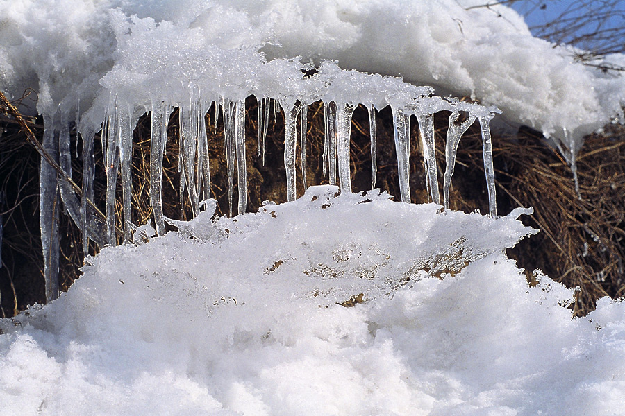 реки или к краю обрыва, можно увидеть, что южный склон уже ощутимо подтаял. Под снежным карнизом образовалась колоннада