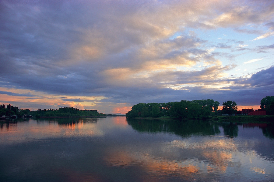 невообразимым богатством красок. Ветер постепенно стихал, и в водной глади реки, как в
