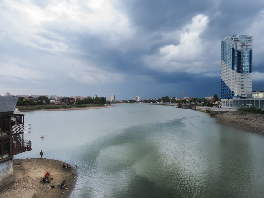 Вот и сегодня, придя на набережную Кубани, я стал свидетелем интересных погодных явлений. Подгоняемая крепнущим ветром, с севера надвигалась плотная громада свинцовых туч, клубившаяся причудливыми формами и блиставшая в разрывах ослепительной белизной. Широкое русло Кубани подёрнулось рябью, а смешавшиеся воды окрасили его полосами и пятнами различных оттенков.