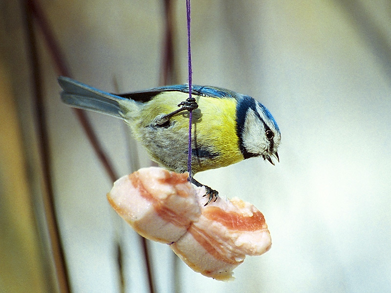 Комментарий. Маленькая и хрупкая на вид, синичка-лазоревка (Parus caeruleus) - существо не робкого десятка! Эта отважная кроха почти не боится людей, садится на руку, если угостить её семечками, часто залетает на балконы и даже в квартиры ближайших к лесопаркам домов. Зимой, когда холодно и голодно, она практически всеядна, но особенно, как это ни странно, любит сало, ради которого способна проявить чудеса ловкости и акробатики!