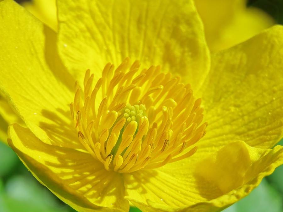 Именно в таких сырых, переувлажнённых местах в начале мая, среди широких, зубчатых тёмно-зелёных листьев с атласным блеском вдруг появляются фантастические "золотые россыпи" крупных ярко-жёлтых цветов.