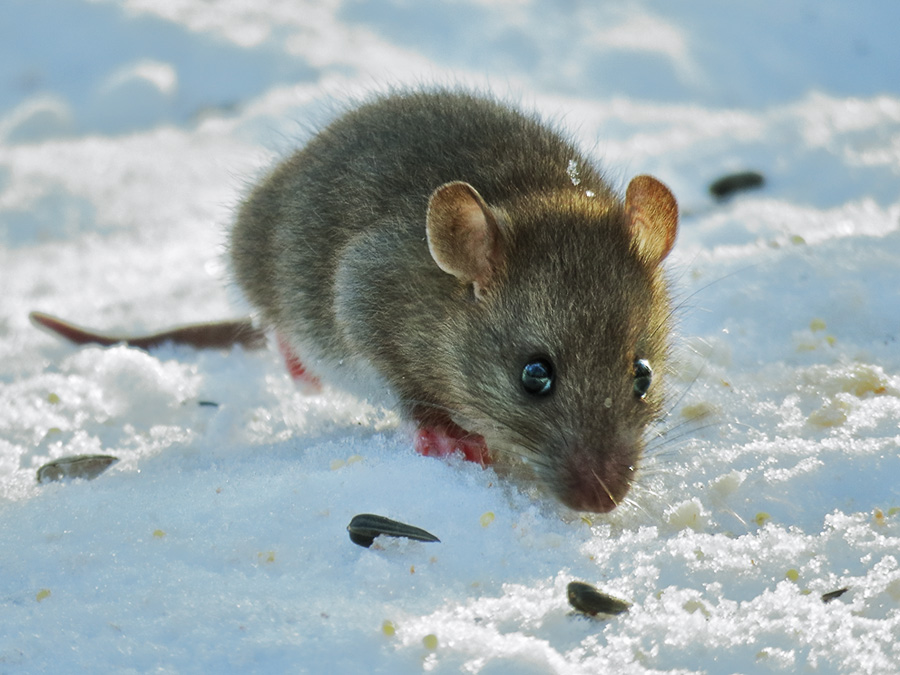 Молодой крысёнок пришёл полакомиться птичьим угощением, выпавшим из кормушки.