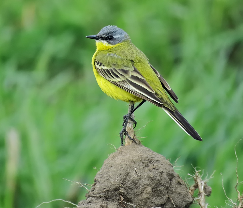 Жёлтая трясогузка (Motacilla flava) красуется, усевшись на ком перепаханной земли. Её, в отличие от трясогузки белой, нечасто