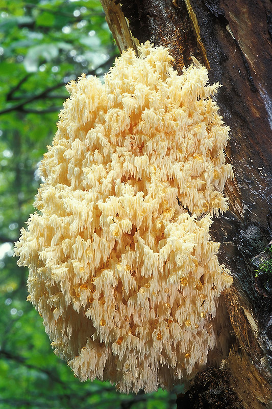 дождливыми, что выросли поистине грандиозные экземпляры! Например, вот этот ежовик ветвистый (Hericium ramosum), не менее 20 сантиметров в высоту, напоминающий гнездо каких-то таинственных существ. Гриб казался медово-кремовым, источавшим