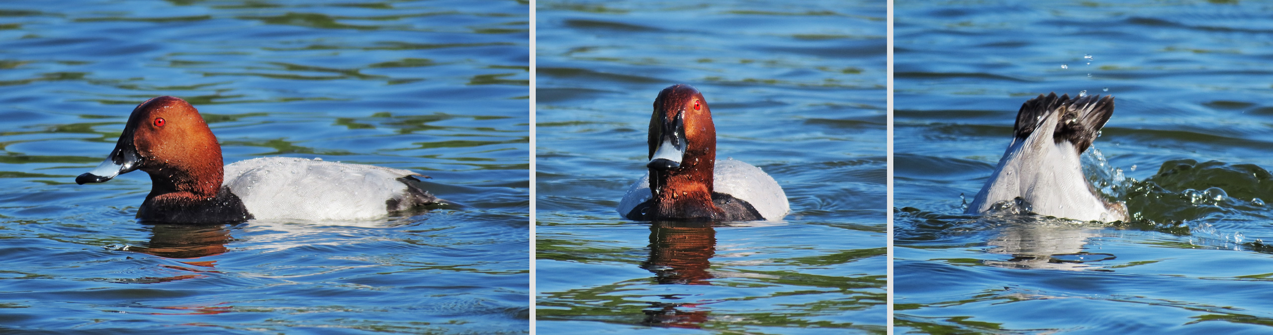 Рано утром на одном из Терлецких прудов я издалека наблюдал стаю из шести красноголовых нырков (Aythya ferina) и вскоре моё терпение было вознаграждено - один из селезней подплыл ближе к берегу и несколько раз нырял, доставая со дна свою привычную пищу - стебли и корневища водных растений.