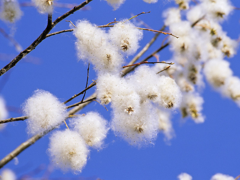 Комментарий. Серёжки ивы (Salix sp.) с созревшими семенами - словно белые пушистые овечки, пасущиеся на небесных равнинах.