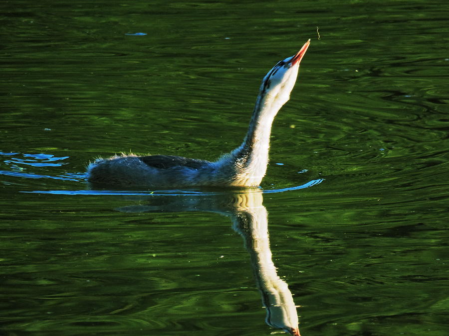 Комментарий. Птенец чомги, поймавший пиявку, подкидывает её в воздух, чтобы проглотить.