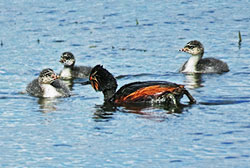 Вот, вдалеке, у зарослей рогоза замечаю: черношейная поганка (Podiceps nigricollis) вывела на "прогулку" троих птенцов.