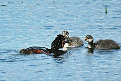я наблюдал у птенцов чомги в момент нападения серебристой чайки).