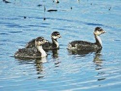 ещё не умеют самостоятельно добывать пищу, но, видимо, уже могут дружно нырнуть под воду в случае опасности. (Такое поведение
