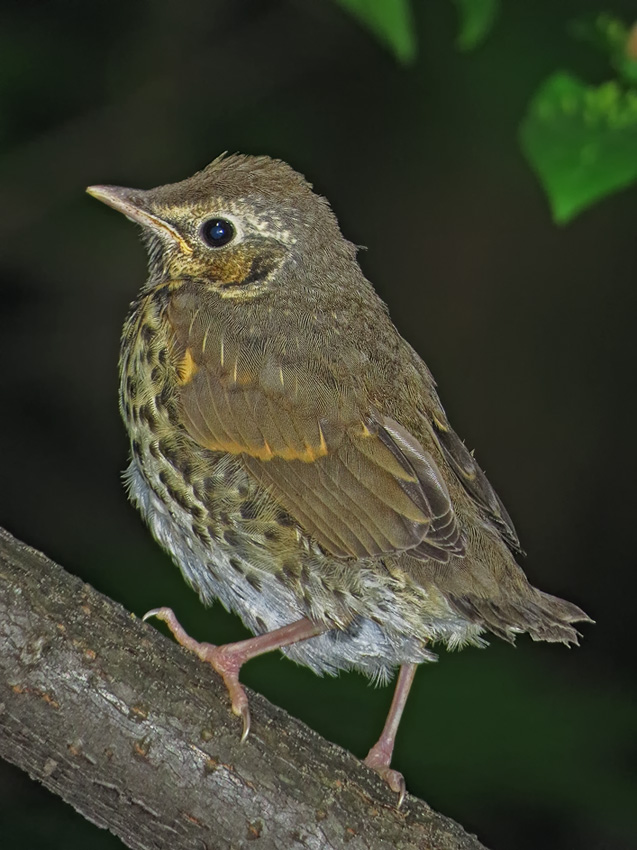Слёток певчего дрозда (Turdus philomelos) уже покинул родное гнездо и приобрёл взрослую окраску, но летать пока толком не