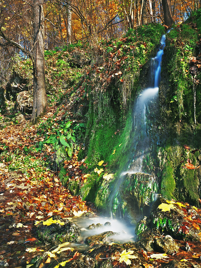 Особенно прекрасен водопад в пору золотой осени, когда склоны оврага усыпаны яркой разноцветной листвой растущих здесь