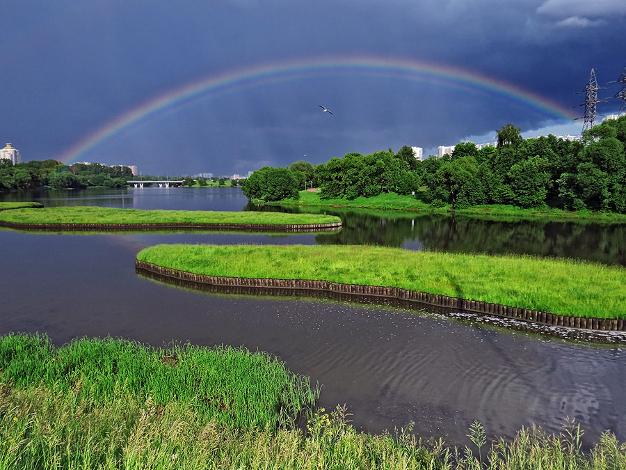 Моментально пришло решение: перейти Шипиловский проезд и глянуть в другую сторону - на Борисовский пруд. И уже с дороги увидели мы огромную, раскинувшуюся от берега до берега яркую разноцветную дугу. Земля, вода, город, омытые дождём и озарённые солнцем, сияли и радовались, предвещая удачу.