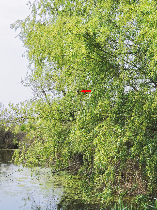 На этот раз моё внимание привлекла большая "плакучая" ива, декоративная форма ветлы (Salix alba), растущая у самого берега.
