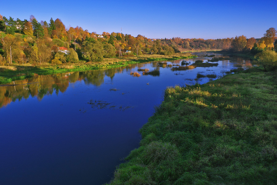 Вид с моста на юго-восточную окраину Рузы и реку, давшую городу своё имя. Тихий погожий октябрьский вечер. Солнце уже