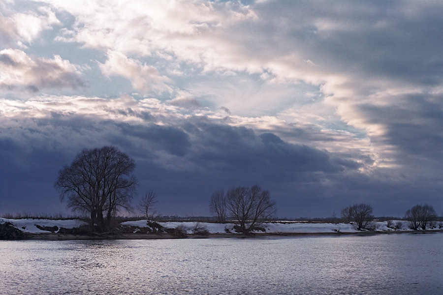 примерно за полчаса до того, как солнце выглянуло из-за туч. Дальний берег Москвы-реки ещё утопает во мраке, но уже