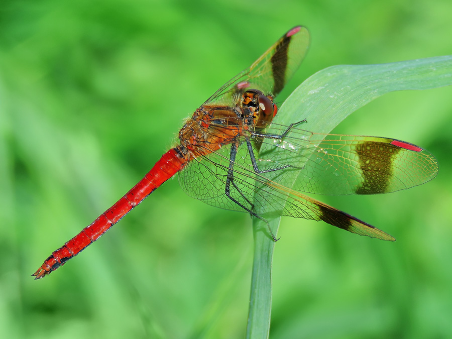 На снимке: ярко окрашенный самец Sympetrum pedemontanum, сидящий на листе лугового злака.