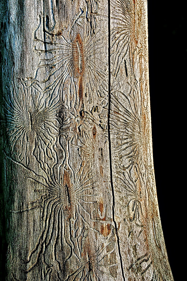 нами ходы жуков-короедов из подсемейства Scolytinae на стволе погибшего по их вине вяза.