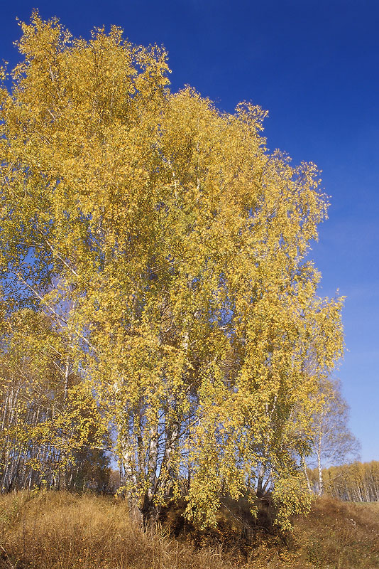 Удивительное сочетание цветов - ярко-синего с золотым. Создаёт ощущение полёта, праздника, возвышенности и величия. Сможет ли кто-нибудь объяснить, как и почему цвет влияет на наше настроение? Разве что, художники, поэты, в далёкой от науки чувственно-образной форме. Редко выдаётся столь яркое сине-золотое состояние Природы. Есть лишь несколько дней, когда в листве уже совсем не осталось зелёного, и пока она не опала с деревьев. Редко, но иногда всё же бывает в такое время пронзительно-синее небо, чья глубина усиливается взглядом снизу вверх. И можно долго смотреть и погружаться в эту бездну - душа летит и поёт!