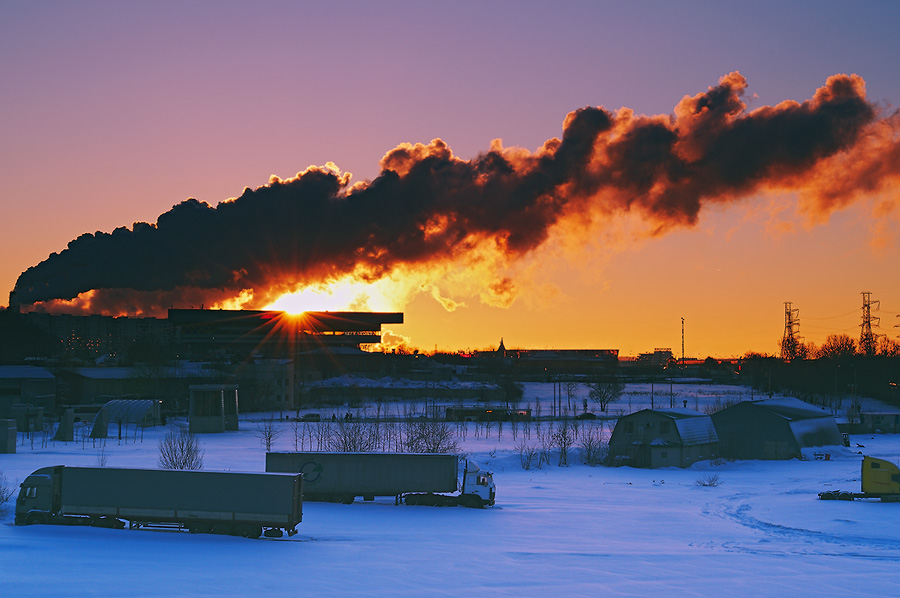 Вдруг, на востоке замечаю массивные клубы пара, валящего из труб, а где-то за ними небо уже начинает окрашиваться пурпурным