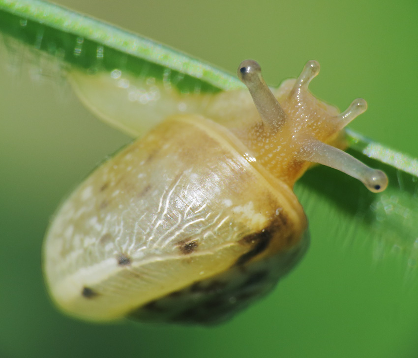 Комментарий. Молодая улитка. Возможно, Helicigona faustina на травинке. Семейство виноградные улитки (Helicidae).