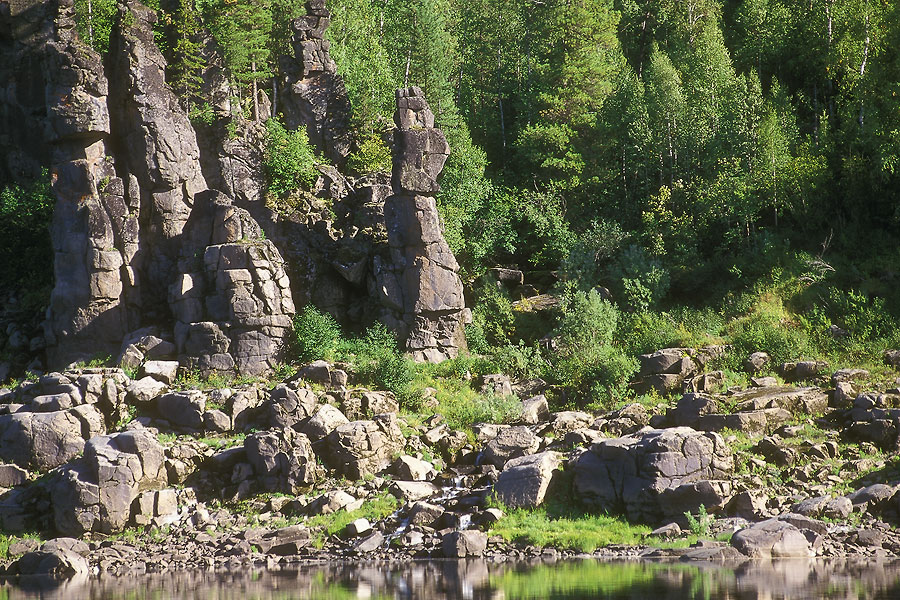 Этот пейзаж открывается взору по левому берегу, где река сильно сужается, зажатая между скал. В очертаниях каменных столбов воображение угадывает черты людей, животных, сказочных персонажей. Смотрите: центральный камень удивительно напоминает Мумми-тролля - маленького сказочного "бегемотика", у которого хорошо видны ушки (или рожки) на голове, глаз, рот, сложенные на животе лапки и даже копытца. Я снимал с противоположного (правого) берега телеобъективом, что позволило приблизить и отчётливо рассмотреть каменные фигуры. Но стоит переплыть реку и подойти вплотную - иллюзия совершенно пропадает.