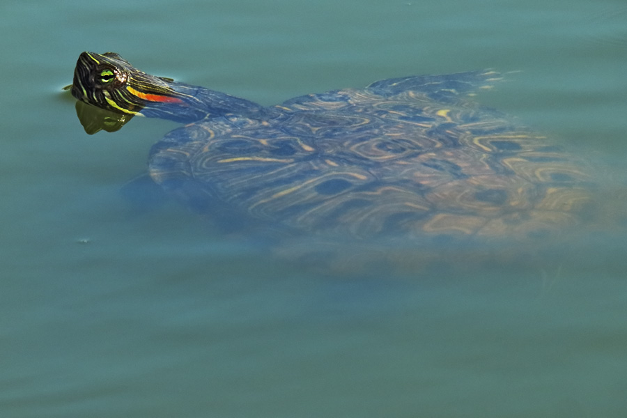 Комментарий. Плывущая красноухая черепаха (Trachemys scripta) таится под поверхностью вод, выставив наружу лишь глаза для наблюдения - будто подводная лодка на перископной глубине.