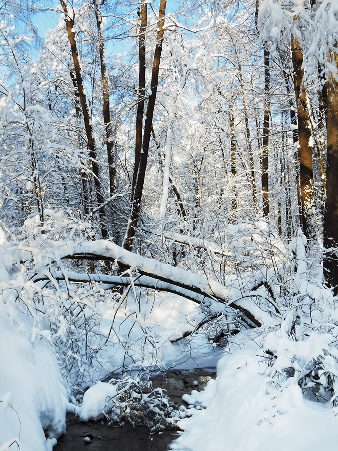 Крутые, обрывистые берега ручья, топкая, болотистая почва, густые заросли кустарников и поваленные деревья - маленький, почти нетронутый уголок "дремучего леса" в черте Москвы! Надо ли говорить, насколько прекрасно и необычно здесь зимой, когда нога не решается ступить в глубокие, искрящиеся пронзительной синевою снега, а глазам не терпится заглянуть: что там, за поворотом?..