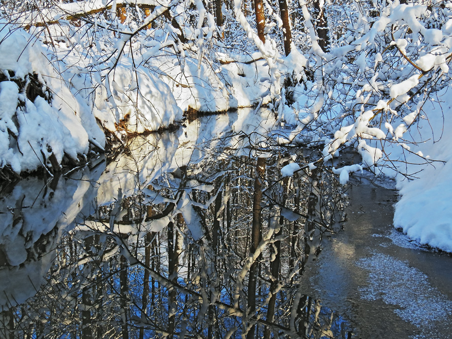 У пересечения с асфальтовой дорогой, чуть ниже мостика с перилами, воды ручья разливаются вширь, образуя небольшую заводь, в которой как в зеркале отражается небо и окружающий лес. Особенно прекрасно это место зимой, когда белизна снега скрывает всё лишнее, принесённое цивилизацией, и придаёт пейзажу первозданную чистоту и торжественность.