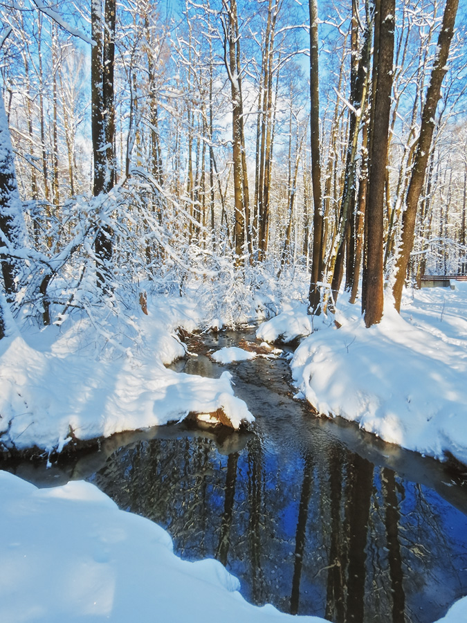заводь, в которой как в зеркале отражается небо и окружающий лес. Особенно прекрасно это место зимой, когда белизна снега