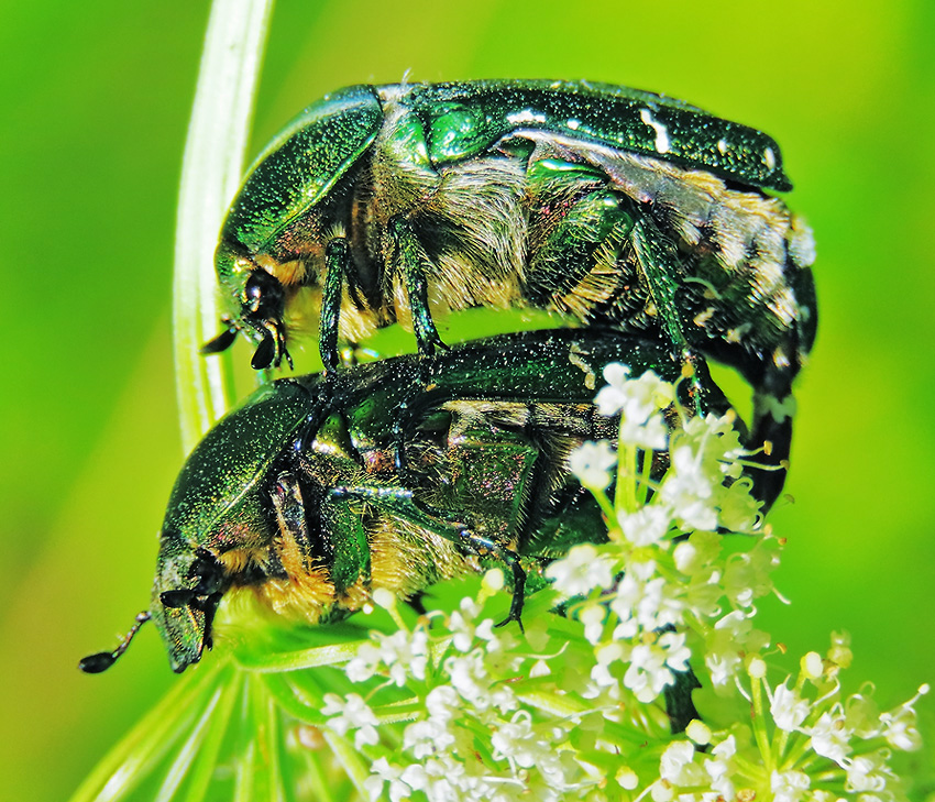 Комментарий. Пара жуков бронзовок золотистых (Cetonia aurata) на соцветии зонтичного растения.