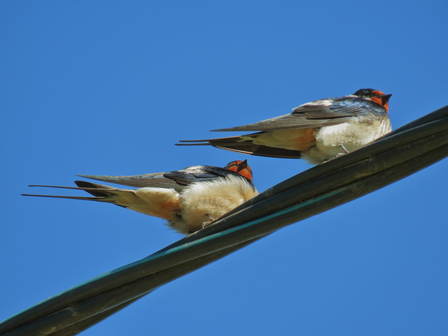 Комментарий. Деревенские ласточки (Hirundo rustica), уютно устроившиеся на силовом кабеле, подвешенном на столбах в дачном посёлке.