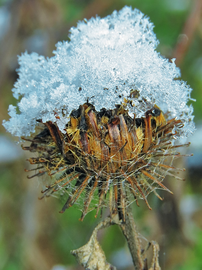 уже завершил свой сезонный цикл: листья отмерли, стебли высохли - лишь корзиночки со зрелыми плодами остались "караулить"