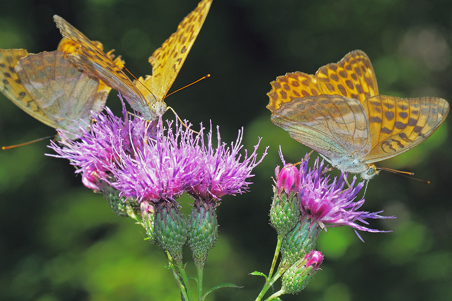 Комментарий. Группа бабочек пафий, или больших лесных перламутровок (Argynnis paphia) из семейства Нимфалид (Nymphalidae) кормится на цветах василька в горном лесу.