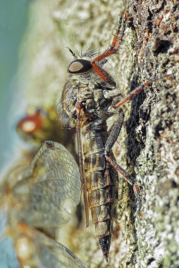 Комментарий. Хищная муха-ктырь, предположительно, Machimus chrysitis, сидящая на стволе осины, рядом с другим, более крупным хищником мира насекомых - стрекозой Sympetrum sp.