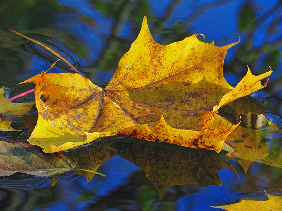резные листья клёна, горящие ярким пламенем красок на фоне лазури вод, отражающих синеву ясного неба.