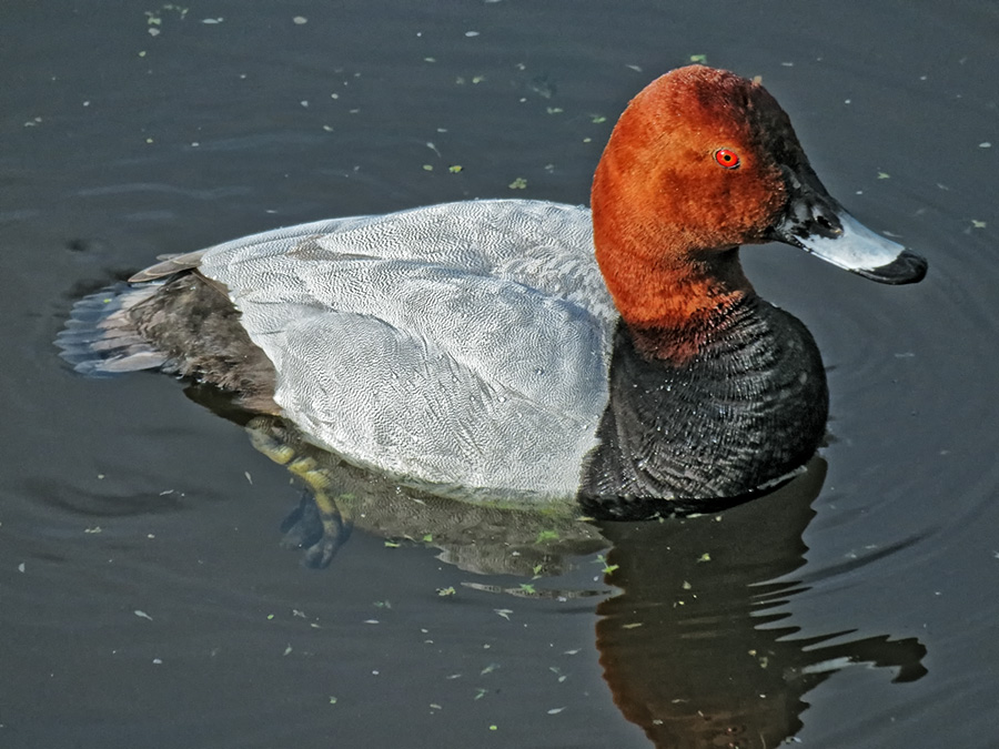 Красноголовый нырок (Aythya ferina) - средних размеров утка, питающаяся преимущественно растительными кормами. Обычный рацион нырка составляют зелёные части растений, корневища и семена. Реже лакомится животной пищей - насекомыми, моллюсками, червями. Состав кормов может меняться в зависимости от сезона и местообитания. Доставая еду со дна водоёма, птица часто ныряет, проводя под водой до 30 секунд и погружаясь на глубину полутора-трёх метров. На воде сидит глубоко, хвост нырка опущен и несколько погружён в воду; при нырянии гребёт лапами, расставленными в стороны, как у жука-плавунца.