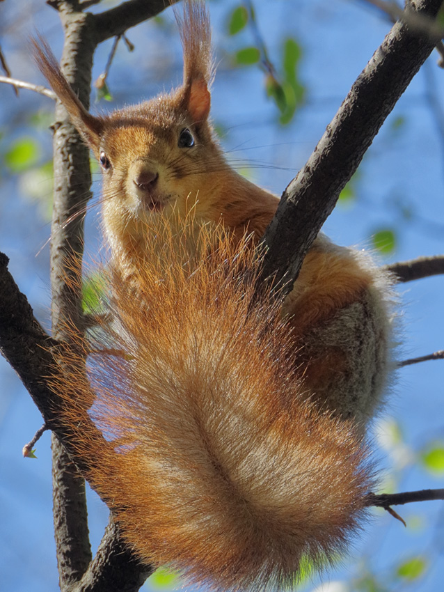 Комментарий. Если прийти в парк рано-рано, можно увидеть много интересного. Вот, например, белочка после холодной ночи греется в тёплых лучах утреннего солнышка. Весна выдалась холодной, и зверёк пока что не торопится менять свой зимний мех на летний.
