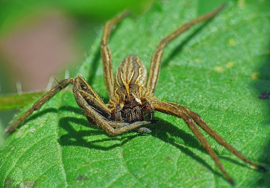Паук, предположительно, из семейства Pisauridae или бродячие охотники, в позе роденовского Мыслителя - будто подпирает