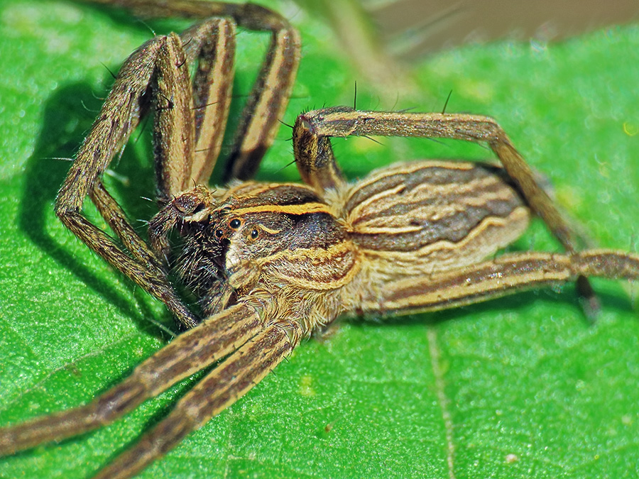 Паук, предположительно, из семейства Pisauridae или бродячие охотники, в позе роденовского Мыслителя - будто