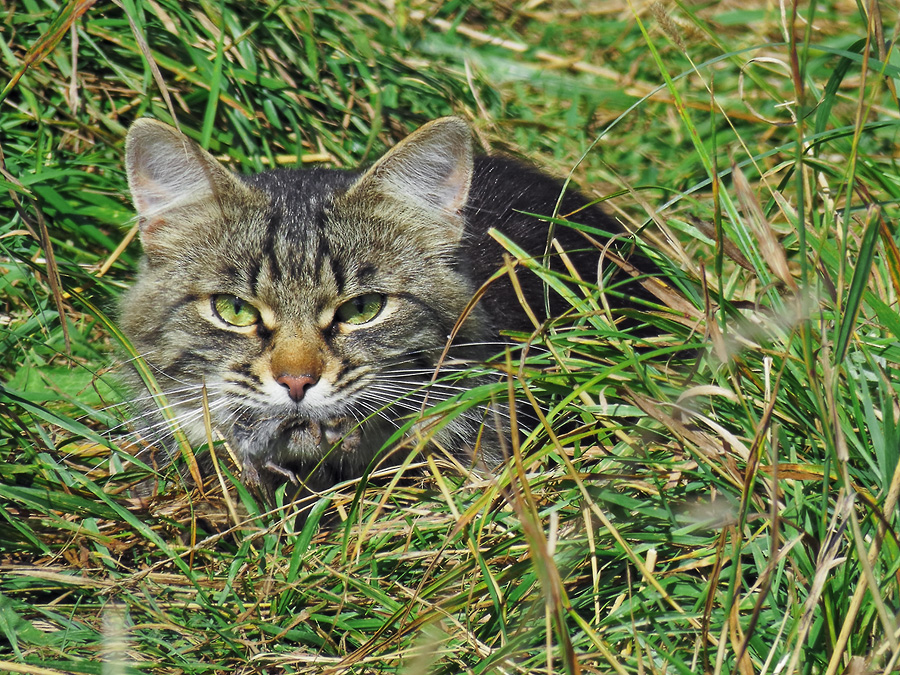 В траве затаился самый настоящий хищник, пронзительный взгляд которого просто не описать словами! Ближе подойти не удалось