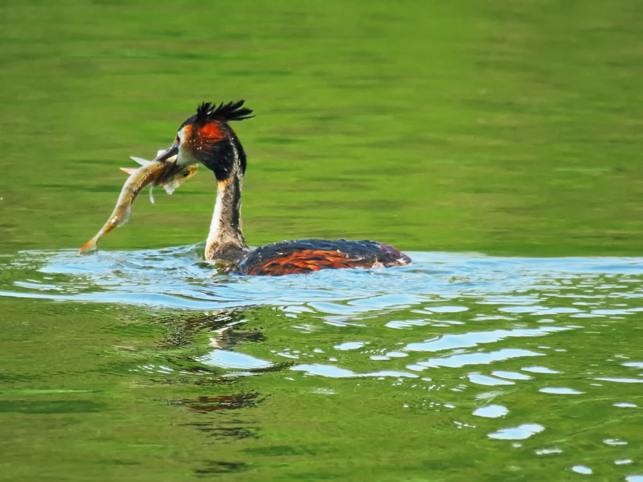 Комментарий. Чомга уверенно держит окуня в клюве, не позволяя ему вырваться, но как проглотить рыбу, ведь её туловище расположено перпендикулярно линии шеи птицы? Надо как-то перехватить добычу, при этом не потеряв её.