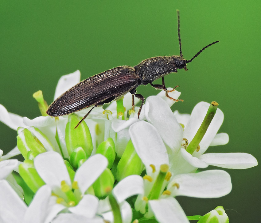 Комментарий. Жук щелкун волосатый (Cidnopus pilosus) из семейства щелкунов (Elateridae), сидящий цветах чесночницы черешчатой (Alliaria petiolata).