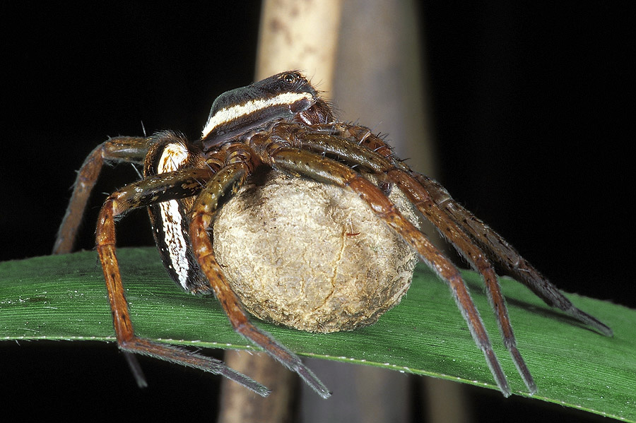 очень крупных для Подмосковья паучих (предположительно, Dolomedes fimbriatus), бережно держащих в лапках коконы с сотнями детёнышей внутри.