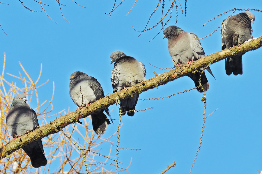 Сизые голуби (Columba livia) уселись рядком на ветке лиственницы у входа в Измайловский парк.