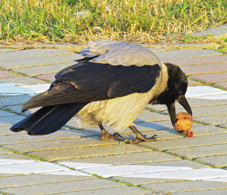 Комментарий. Но, недаром ходят легенды о почти человеческом уме ворон. Наша серая изобретательница не растерялась: поднявшись в небо с добычей в клюве, она просто бросила орех на твёрдую бетонную плитку набережной! Затем ещё и ещё раз, пока в скорлупе не образовались трещины. Теперь силы её клюва достаточно, чтобы добраться до лакомства.