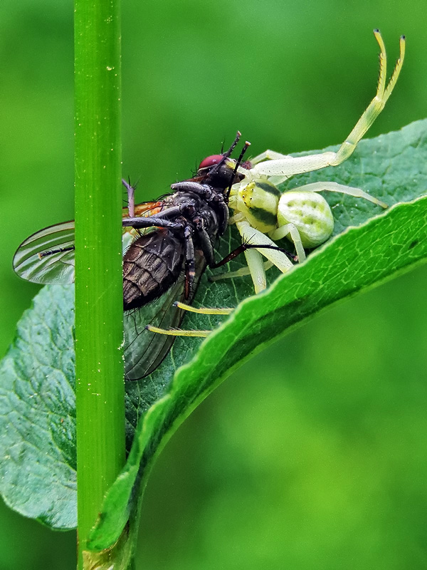 Главная проблема заключается в том, что крайне трудно навести фокус в нужную точку и удерживать в этом положении камеру до момента съёмки. Чем крупнее масштаб, тем, соответственно, труднее. Приходится делать множество кадров наугад в надежде попасть, если, конечно, "модель" будет сидеть на месте. К чести нашего паука надо сказать, что он оказался достаточно терпелив. А мухе уже всё равно...
